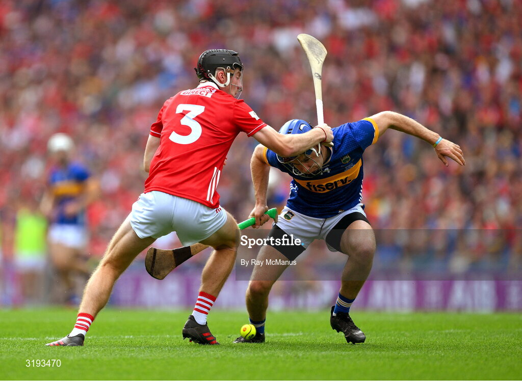 20 July 2025; John McGrath of Tipperary is tackled by Eoin Downey of Cork during the GAA Hurling All-Ireland Senior Championship final match between Cork and Tipperary at Croke Park in Dublin. Photo by Ray McManus/Sportsfile