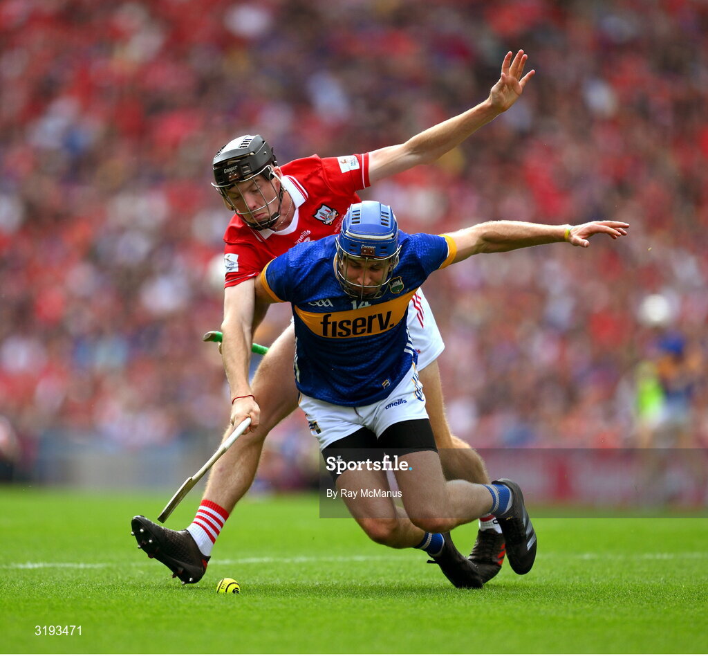 20 July 2025; John McGrath of Tipperary is tackled by Eoin Downey of Cork during the GAA Hurling All-Ireland Senior Championship final match between Cork and Tipperary at Croke Park in Dublin. Photo by Ray McManus/Sportsfile