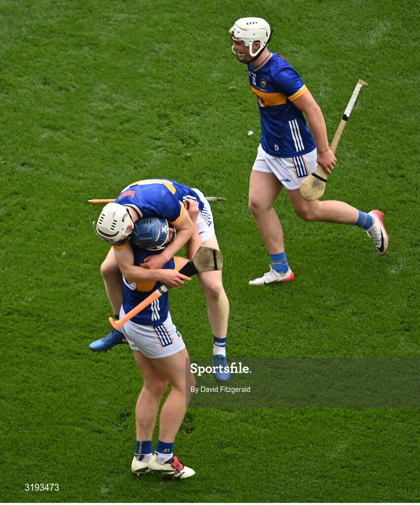 20 July 2025; Jason Forde and Oisín O'Donoghue of Tipperary celebrate after the GAA Hurling All-Ireland Senior Championship final match between Cork and Tipperary at Croke Park in Dublin. Photo by David Fitzgerald/Sportsfile