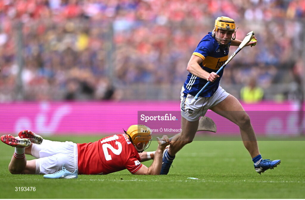 20 July 2025; Conor Stakelum of Tipperary in action against Declan Dalton of Cork during the GAA Hurling All-Ireland Senior Championship final match between Cork and Tipperary at Croke Park in Dublin. Photo by Piaras Ó Mídheach/Sportsfile