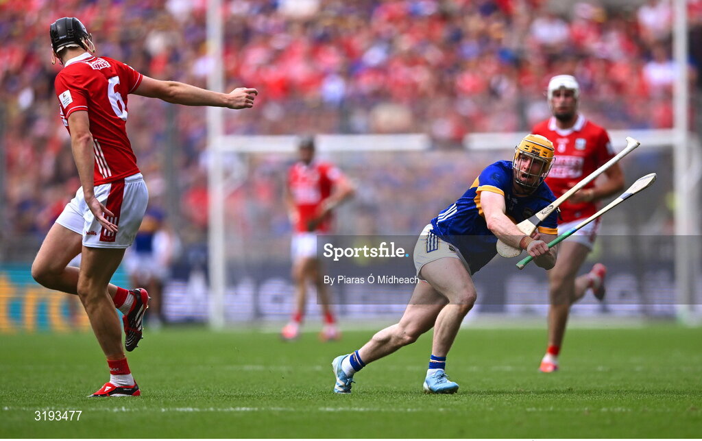 20 July 2025; Andrew Ormond of Tipperary gets tangled up with the hurl of Robert Downey of Cork during the GAA Hurling All-Ireland Senior Championship final match between Cork and Tipperary at Croke Park in Dublin. Photo by Piaras Ó Mídheach/Sportsfile