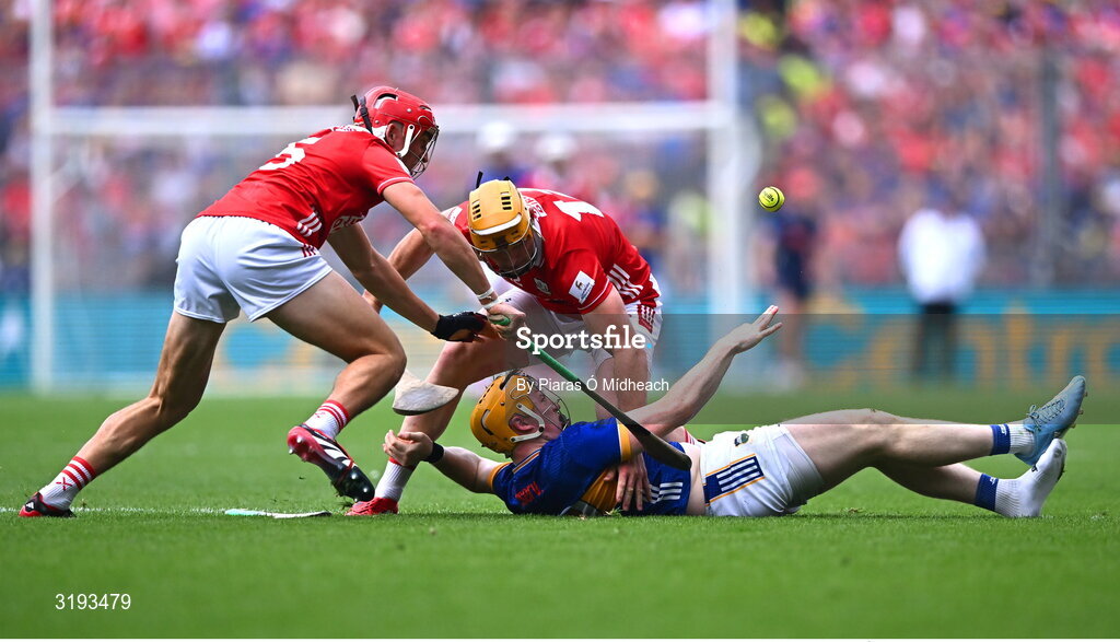 20 July 2025; Jake Morris of Tipperary passes, after losing his boot, in action against Ciarán Joyce, left, and Declan Dalton of Cork during the GAA Hurling All-Ireland Senior Championship final match between Cork and Tipperary at Croke Park in Dublin. Photo by Piaras Ó Mídheach/Sportsfile