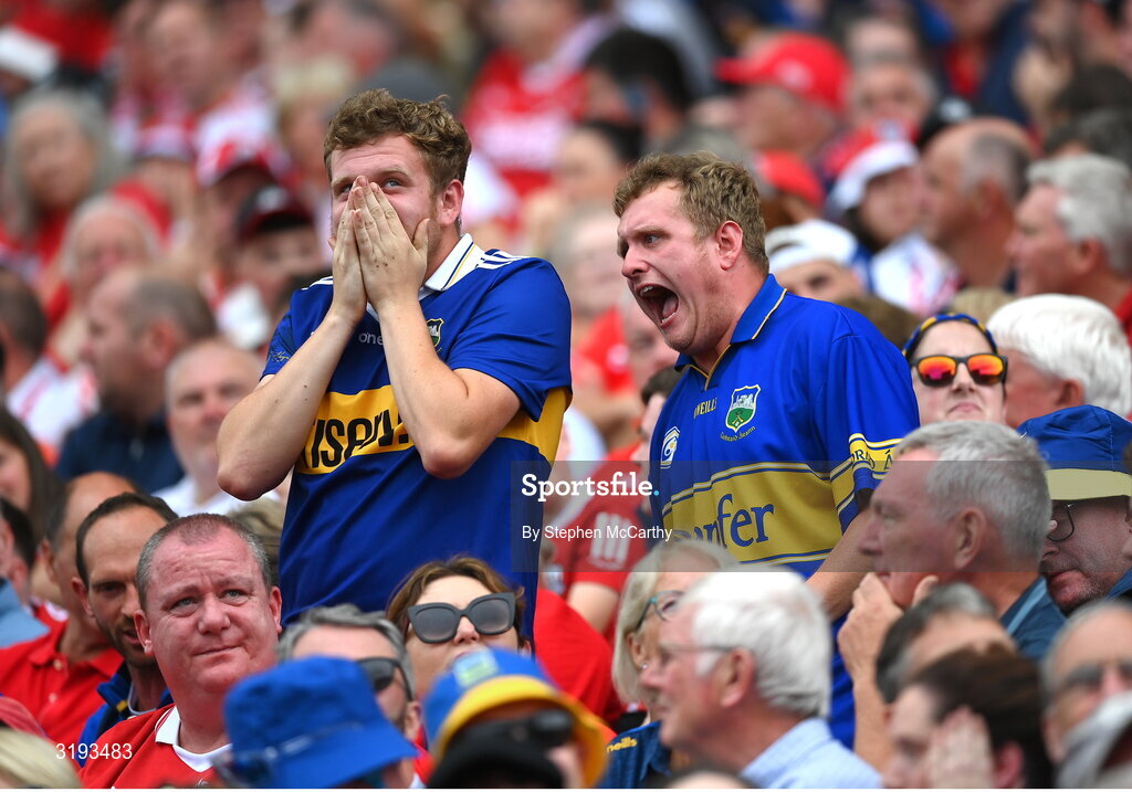 20 July 2025; Tipperary supporters celebrate during the GAA Hurling All-Ireland Senior Championship final match between Cork and Tipperary at Croke Park in Dublin. Photo by Stephen McCarthy/Sportsfile