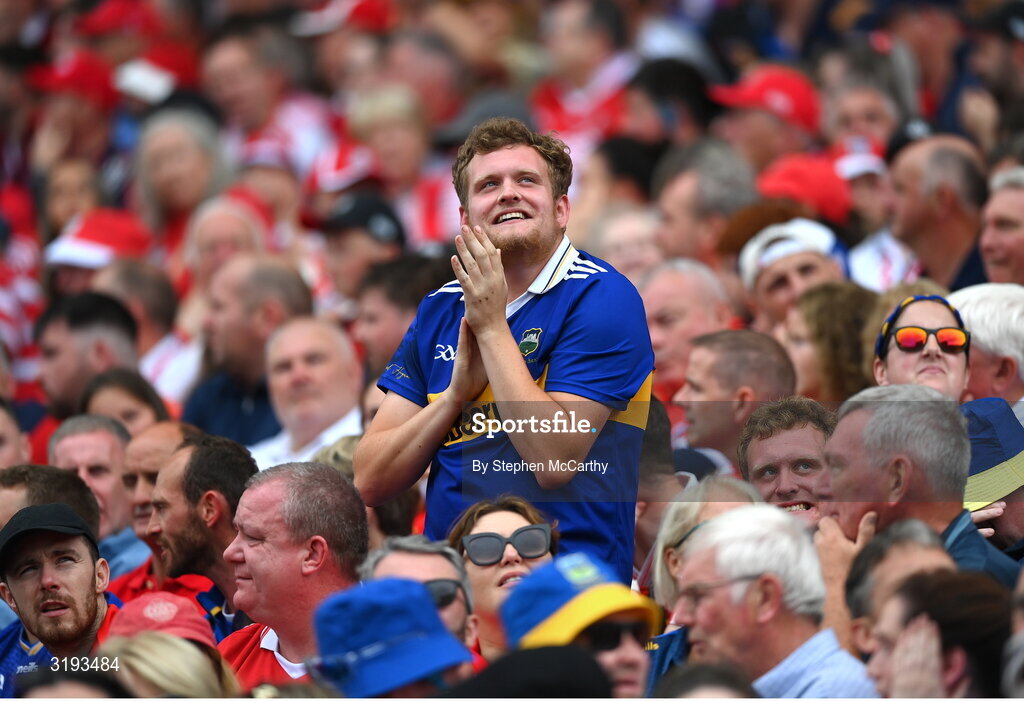 20 July 2025; A Tipperary supporter celebrates during the GAA Hurling All-Ireland Senior Championship final match between Cork and Tipperary at Croke Park in Dublin. Photo by Stephen McCarthy/Sportsfile