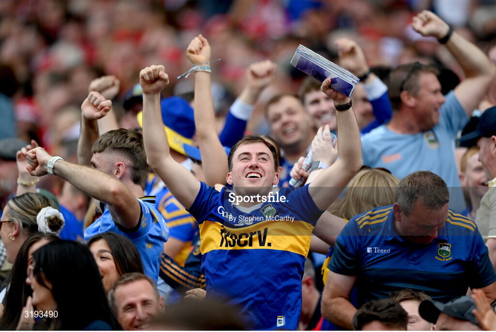 20 July 2025; Tipperary supporters celebrate a goal during the GAA Hurling All-Ireland Senior Championship final match between Cork and Tipperary at Croke Park in Dublin. Photo by Stephen McCarthy/Sportsfile