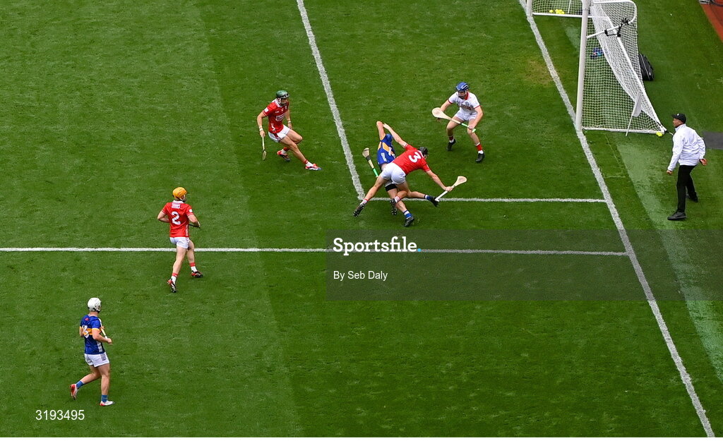 20 July 2025; John McGrath of Tipperary is fouled by Eoin Downey of Cork, resulting in a penalty for Tipperary and a red card for Eoin Downey, during the GAA Hurling All-Ireland Senior Championship final match between Cork and Tipperary at Croke Park in Dublin. Photo by Seb Daly/Sportsfile
