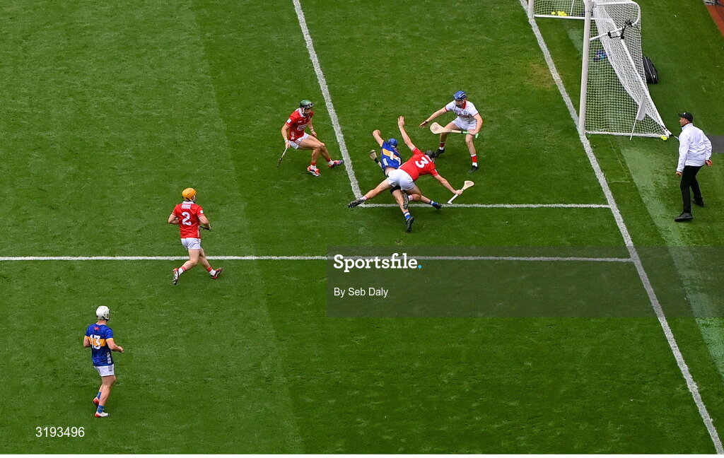20 July 2025; John McGrath of Tipperary is fouled by Eoin Downey of Cork, resulting in a penalty for Tipperary and a red card for Eoin Downey, during the GAA Hurling All-Ireland Senior Championship final match between Cork and Tipperary at Croke Park in Dublin. Photo by Seb Daly/Sportsfile