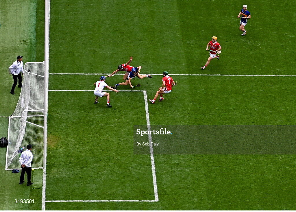 20 July 2025; John McGrath of Tipperary is fouled by Eoin Downey of Cork, resulting in a penalty for Tipperary and a red card for Eoin Downey, during the GAA Hurling All-Ireland Senior Championship final match between Cork and Tipperary at Croke Park in Dublin. Photo by Seb Daly/Sportsfile
