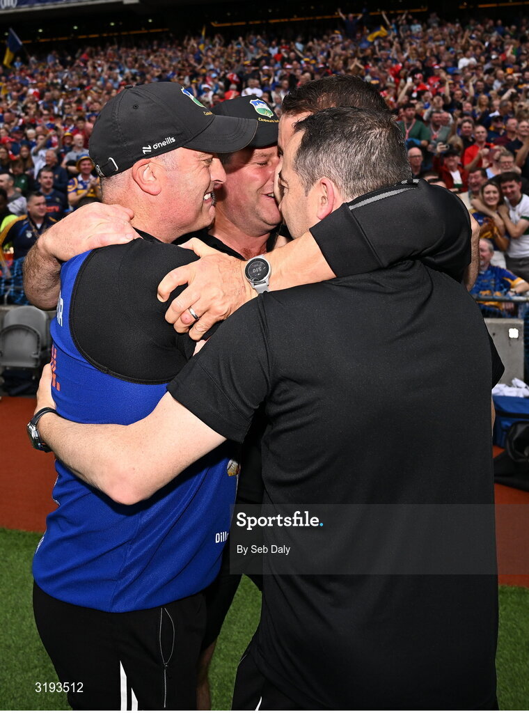 20 July 2025; Tipperary manager Liam Cahill, left, celebrates with his backroom staff after their side's victory in the GAA Hurling All-Ireland Senior Championship final match between Cork and Tipperary at Croke Park in Dublin. Photo by Seb Daly/Sportsfile