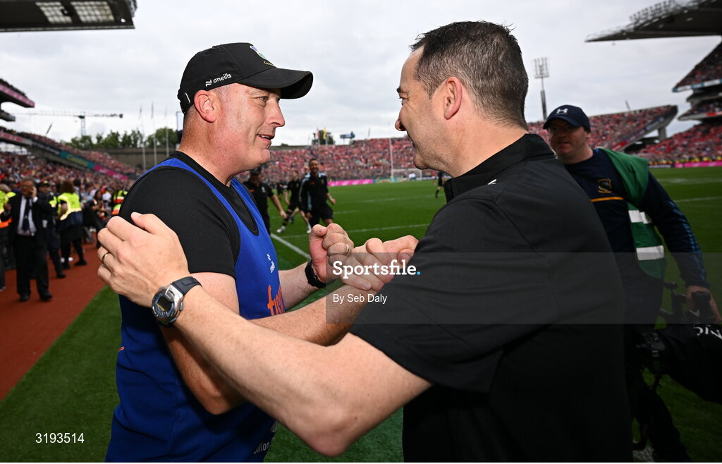 20 July 2025; Tipperary manager Liam Cahill, left, and selector Michael Bevans celebrate after their side's victory in the GAA Hurling All-Ireland Senior Championship final match between Cork and Tipperary at Croke Park in Dublin. Photo by Seb Daly/Sportsfile