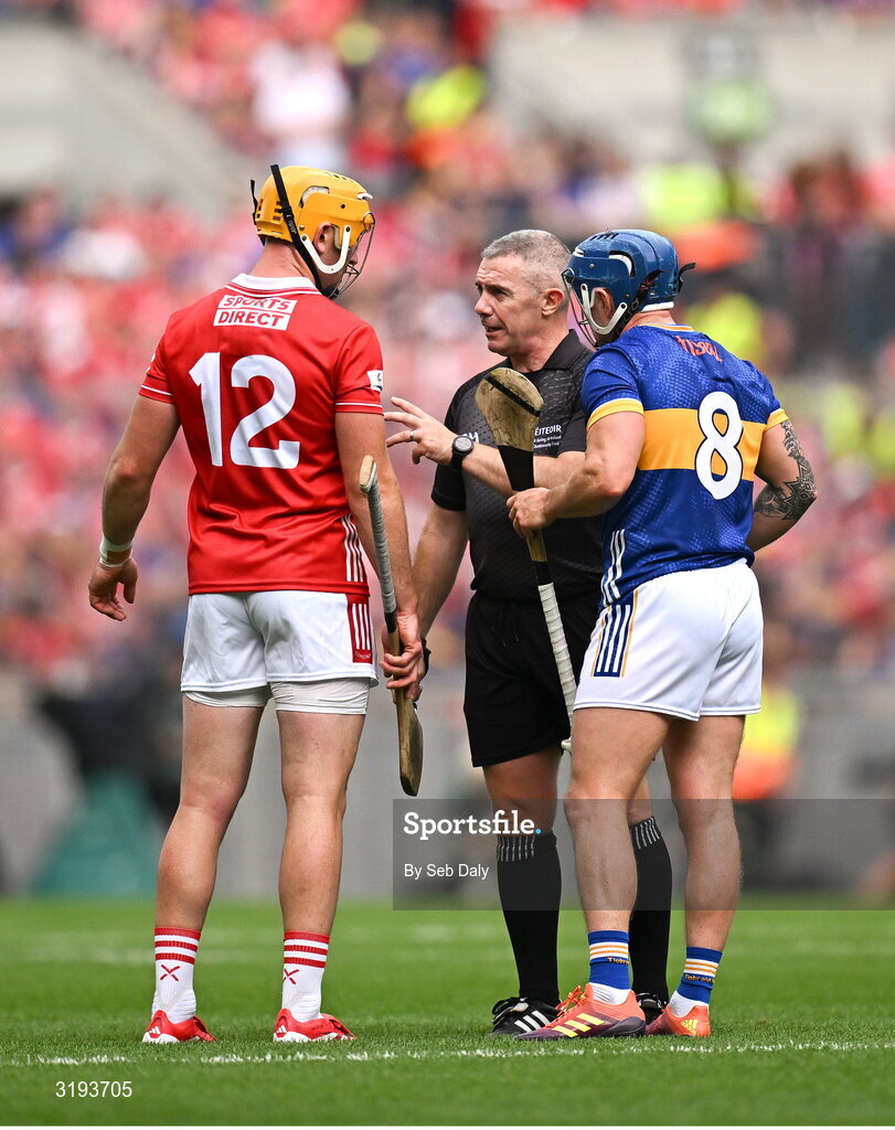 20 July 2025; Referee Liam Gordon talks to Declan Dalton of Cork and Willie Connors of Tipperary during the GAA Hurling All-Ireland Senior Championship final match between Cork and Tipperary at Croke Park in Dublin. Photo by Seb Daly/Sportsfile