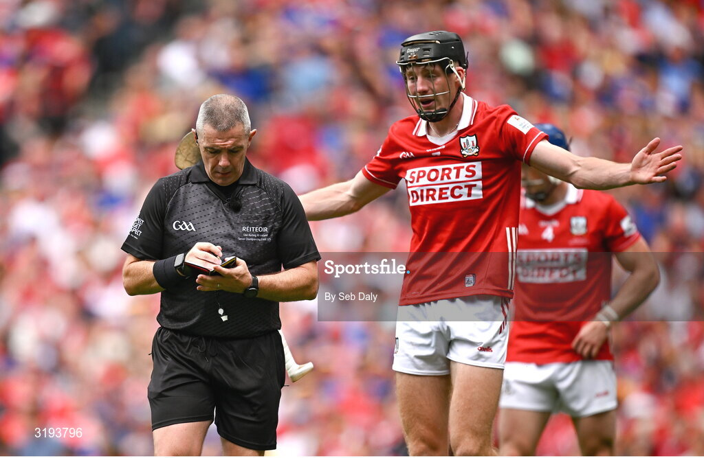 20 July 2025; Eoin Downey of Cork remonstrates with referee Liam Gordon before being shown a red card during the GAA Hurling All-Ireland Senior Championship final match between Cork and Tipperary at Croke Park in Dublin. Photo by Seb Daly/Sportsfile