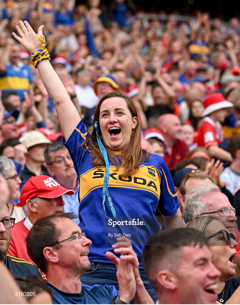 20 July 2025; A Tipperary supporter during the GAA Hurling All-Ireland Senior Championship final match between Cork and Tipperary at Croke Park in Dublin. Photo by Seb Daly/Sportsfile
