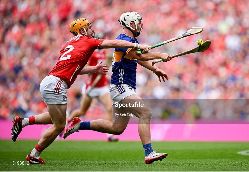 20 July 2025; Darragh McCarthy of Tipperary in action against Niall O'Leary of Cork during the GAA Hurling All-Ireland Senior Championship final match between Cork and Tipperary at Croke Park in Dublin. Photo by Seb Daly/Sportsfile