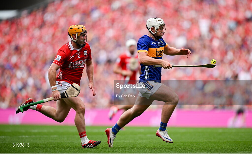20 July 2025; Darragh McCarthy of Tipperary in action against Niall O'Leary of Cork during the GAA Hurling All-Ireland Senior Championship final match between Cork and Tipperary at Croke Park in Dublin. Photo by Seb Daly/Sportsfile