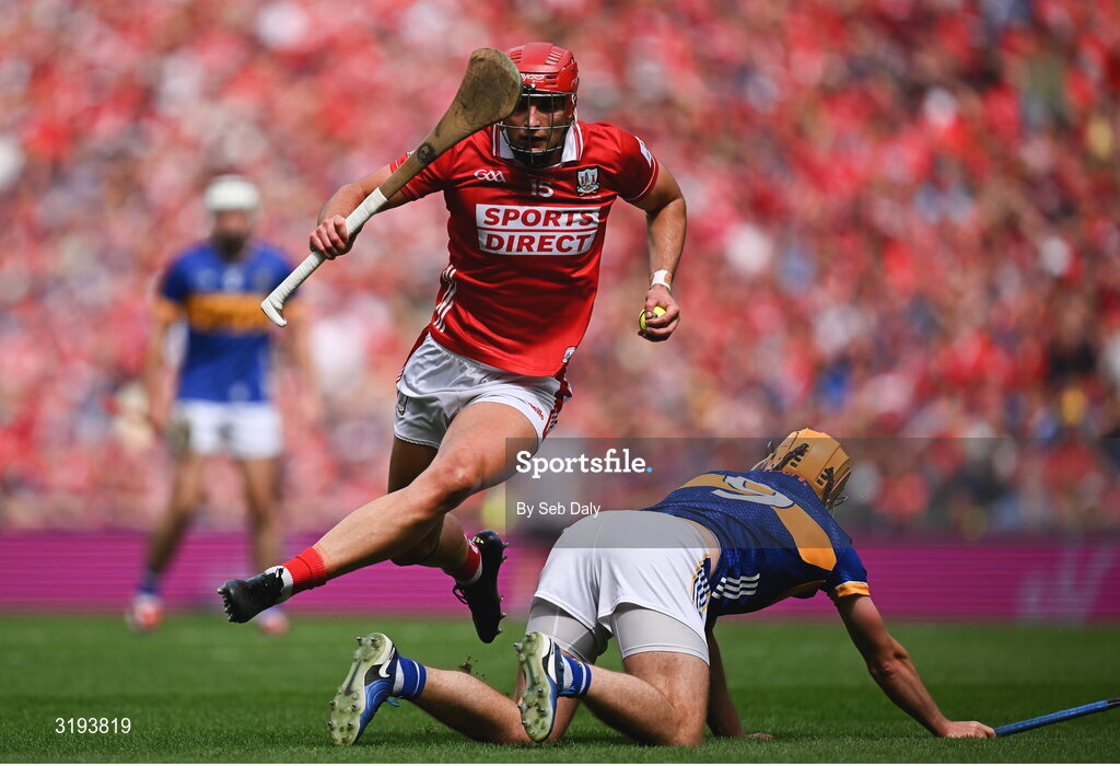 20 July 2025; Brian Hayes of Cork hops over Tipperary's Conor Stakelum during the GAA Hurling All-Ireland Senior Championship final match between Cork and Tipperary at Croke Park in Dublin. Photo by Seb Daly/Sportsfile