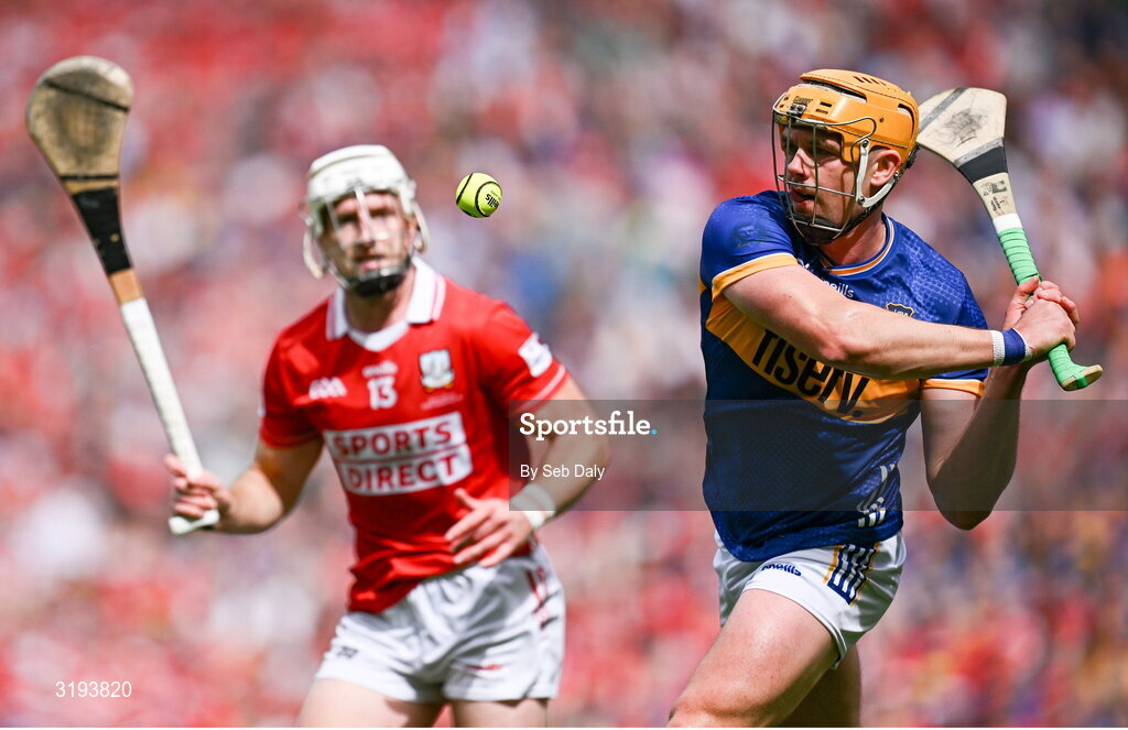 20 July 2025; Ronan Maher of Tipperary and Patrick Horgan of Cork during the GAA Hurling All-Ireland Senior Championship final match between Cork and Tipperary at Croke Park in Dublin. Photo by Seb Daly/Sportsfile