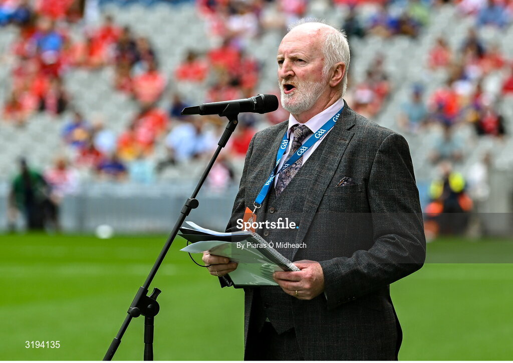 20 July 2025; MC Mac Dara Mac Donncha introduces the 2000 All-Ireland winning Kilkenny hurling jubilee team who were honoured before the GAA Hurling All-Ireland Senior Championship final match between Cork and Tipperary at Croke Park in Dublin. Photo by Piaras Ó Mídheach/Sportsfile