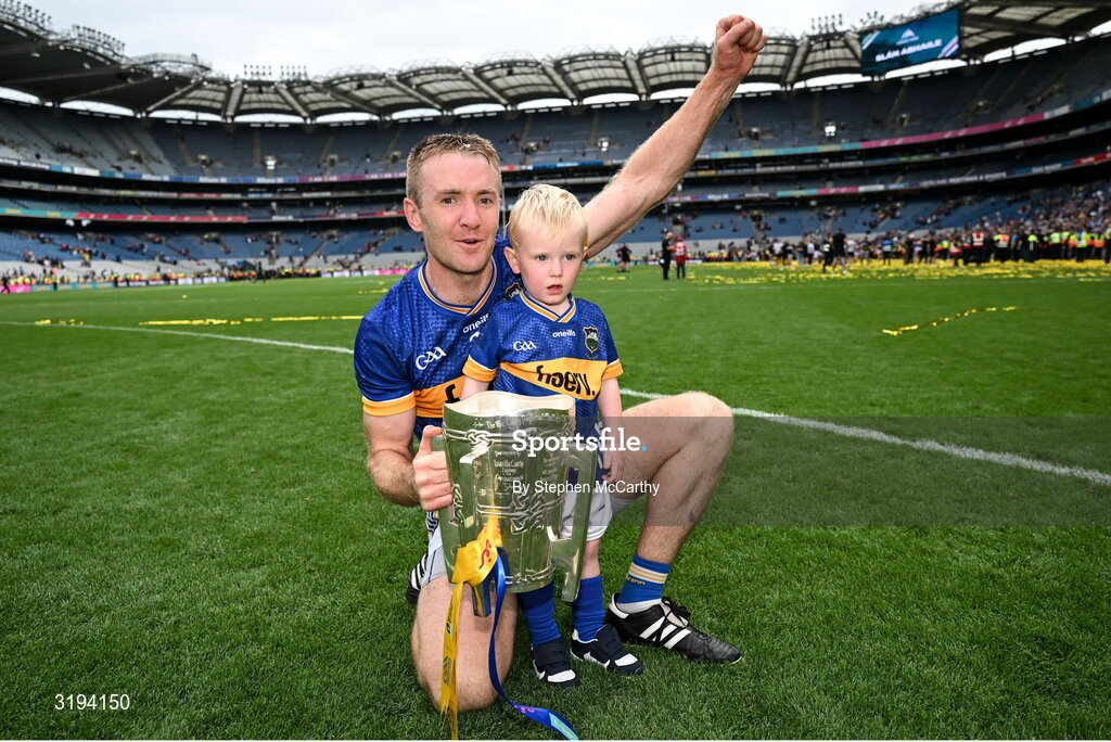20 July 2025; Noel McGrath of Tipperary and his son Sam celebrate with the Liam MacCarthy cup after his side's victory in the GAA Hurling All-Ireland Senior Championship final match between Cork and Tipperary at Croke Park in Dublin. Photo by Stephen McCarthy/Sportsfile