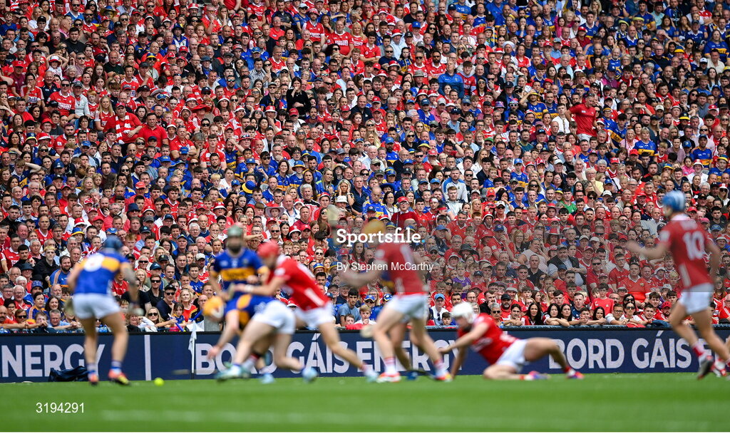 20 July 2025; Supporters watch on during the GAA Hurling All-Ireland Senior Championship final match between Cork and Tipperary at Croke Park in Dublin. Photo by Stephen McCarthy/Sportsfile