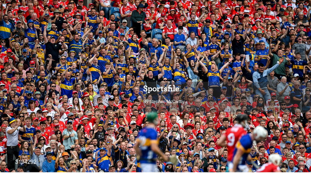 20 July 2025; Tipperary supporters celebrate their side winning a free during the GAA Hurling All-Ireland Senior Championship final match between Cork and Tipperary at Croke Park in Dublin. Photo by Stephen McCarthy/Sportsfile