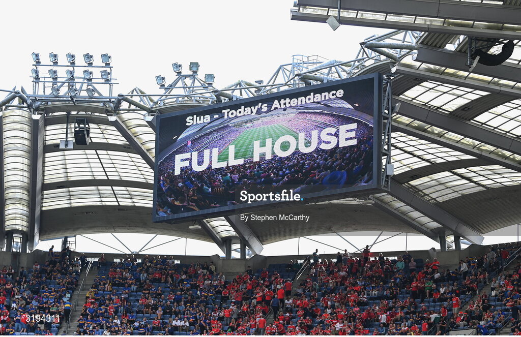 20 July 2025; The big screen shows a "Full House" attendance during the GAA Hurling All-Ireland Senior Championship final match between Cork and Tipperary at Croke Park in Dublin. Photo by Stephen McCarthy/Sportsfile