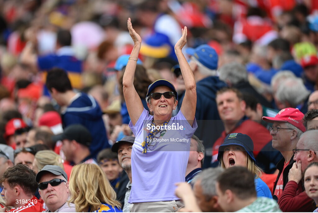 20 July 2025; A Tipperary supporter celebrates during the GAA Hurling All-Ireland Senior Championship final match between Cork and Tipperary at Croke Park in Dublin. Photo by Stephen McCarthy/Sportsfile