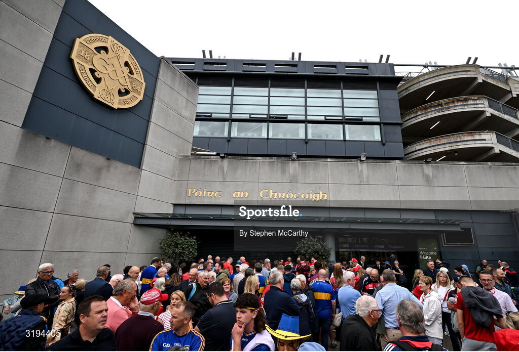 20 July 2025; Supporters wait to enter Croke Park on Jones' Road before the GAA Hurling All-Ireland Senior Championship final match between Cork and Tipperary at Croke Park in Dublin. Photo by Stephen McCarthy/Sportsfile