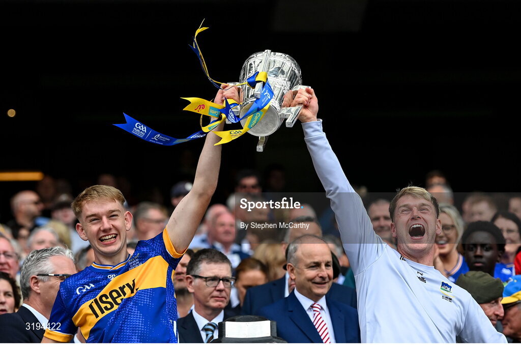 20 July 2025; Tipperary's Paddy McCormack, left, and Ray McCormack lift the Liam MacCarthy cup after the GAA Hurling All-Ireland Senior Championship final match between Cork and Tipperary at Croke Park in Dublin. Photo by Stephen McCarthy/Sportsfile