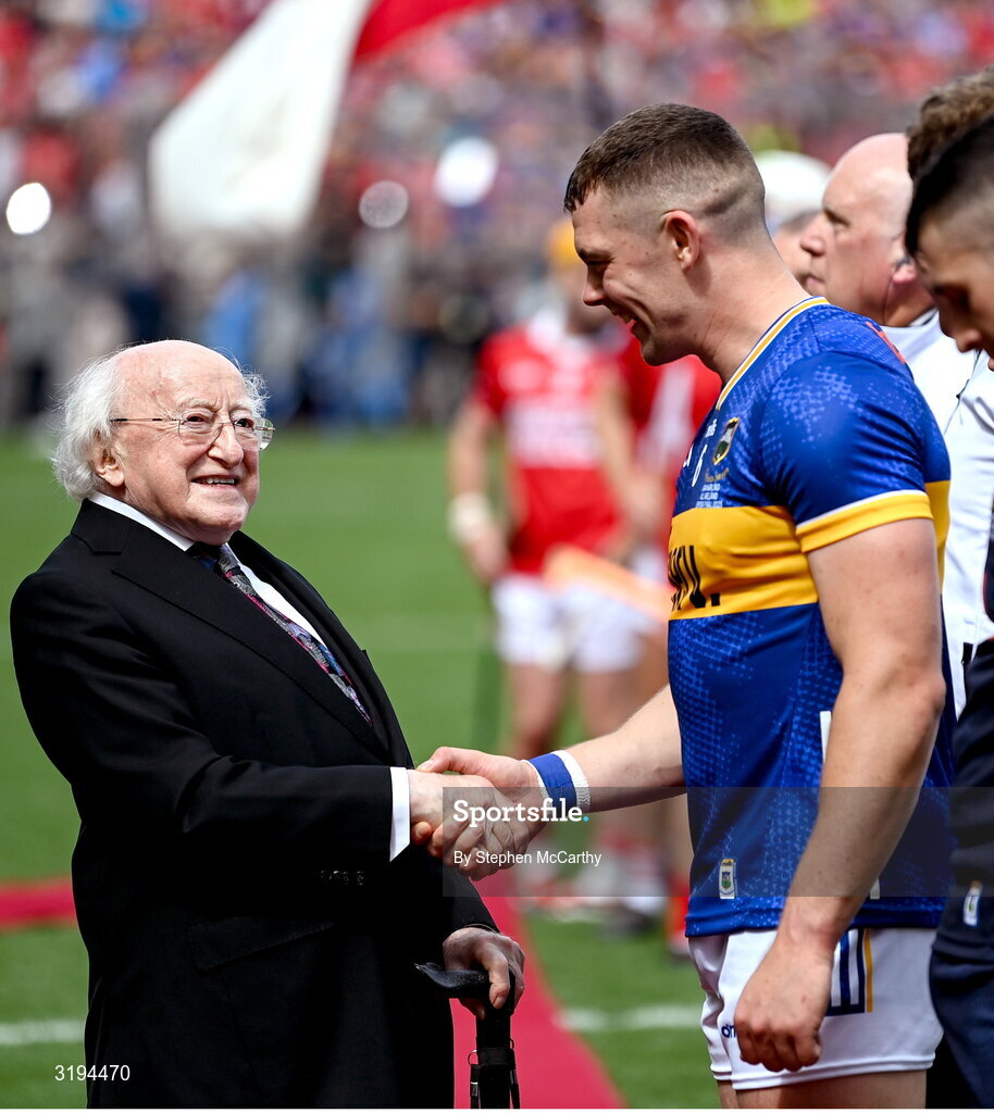 20 July 2025; President of Ireland Michael D Higgins meets Tipperary captain Ronan Maher before the GAA Hurling All-Ireland Senior Championship final match between Cork and Tipperary at Croke Park in Dublin. Photo by Stephen McCarthy/Sportsfile