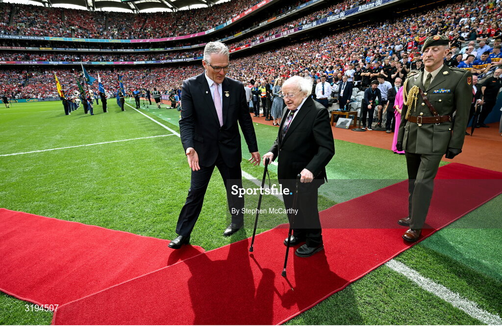 20 July 2025; President of Ireland Michael D Higgins with Uachtarán Chumann Lúthchleas Gael Jarlath Burns before the GAA Hurling All-Ireland Senior Championship final match between Cork and Tipperary at Croke Park in Dublin. Photo by Stephen McCarthy/Sportsfile