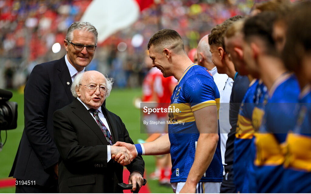 20 July 2025; President of Ireland Michael D Higgins, in the company of Uachtarán Chumann Lúthchleas Gael Jarlath Burns, left, meets Tipperary captain Ronan Maher before the GAA Hurling All-Ireland Senior Championship final match between Cork and Tipperary at Croke Park in Dublin. Photo by Stephen McCarthy/Sportsfile