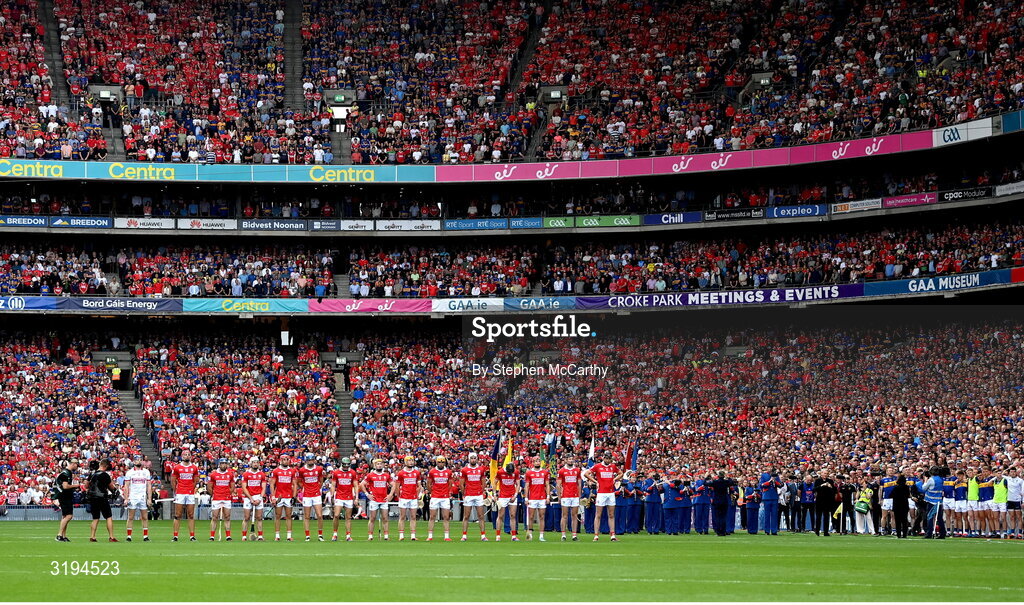 20 July 2025; Cork players stand for the playing of the National Anthem before the GAA Hurling All-Ireland Senior Championship final match between Cork and Tipperary at Croke Park in Dublin. Photo by Stephen McCarthy/Sportsfile