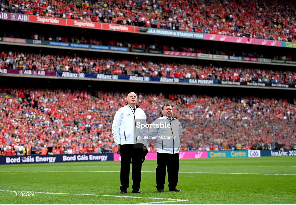 20 July 2025; Umpires stand for the playing of the National Anthem before the GAA Hurling All-Ireland Senior Championship final match between Cork and Tipperary at Croke Park in Dublin. Photo by Stephen McCarthy/Sportsfile