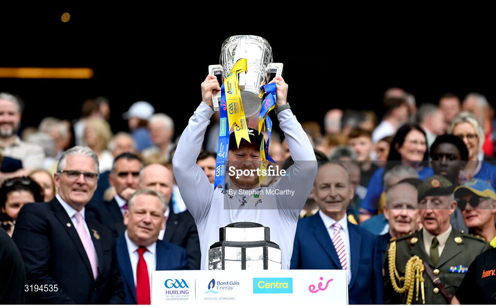 20 July 2025; Tipperary sport psychologist Cathal Sheridan lifts the Liam MacCarthy cup after victory in the GAA Hurling All-Ireland Senior Championship final match between Cork and Tipperary at Croke Park in Dublin. Photo by Stephen McCarthy/Sportsfile