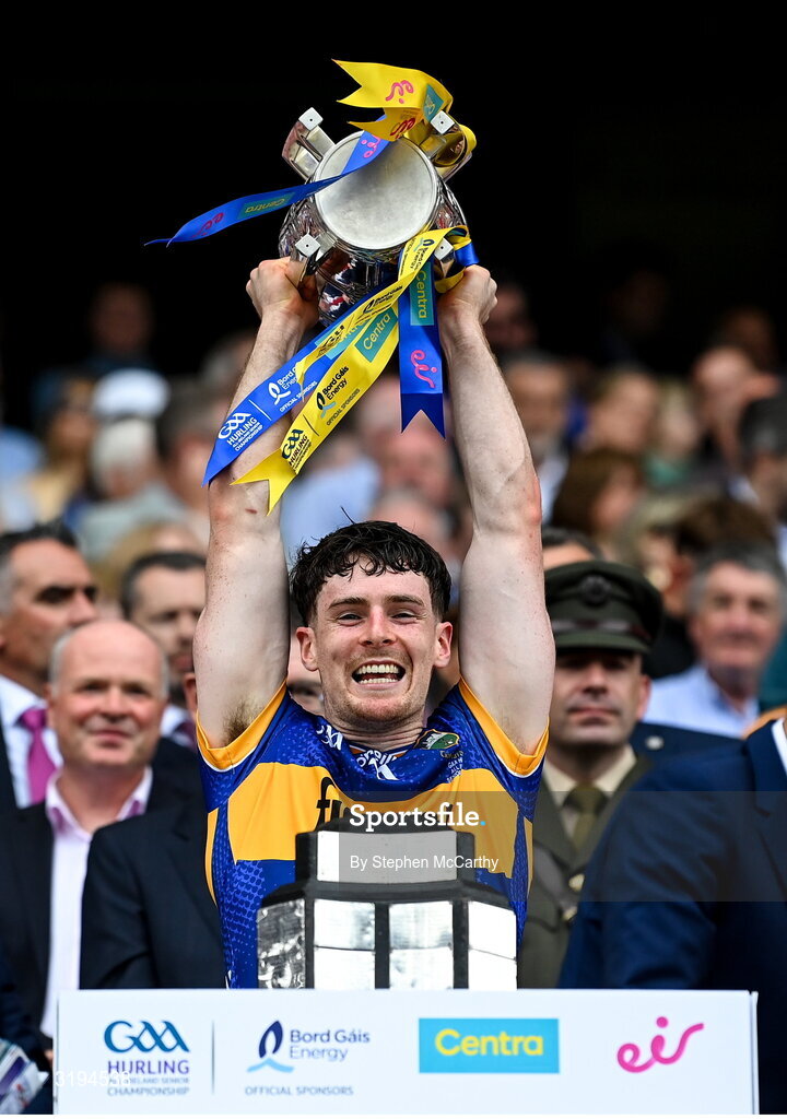 20 July 2025; Andrew Ormond of Tipperary lifts the Liam MacCarthy cup after victory in the GAA Hurling All-Ireland Senior Championship final match between Cork and Tipperary at Croke Park in Dublin. Photo by Stephen McCarthy/Sportsfile