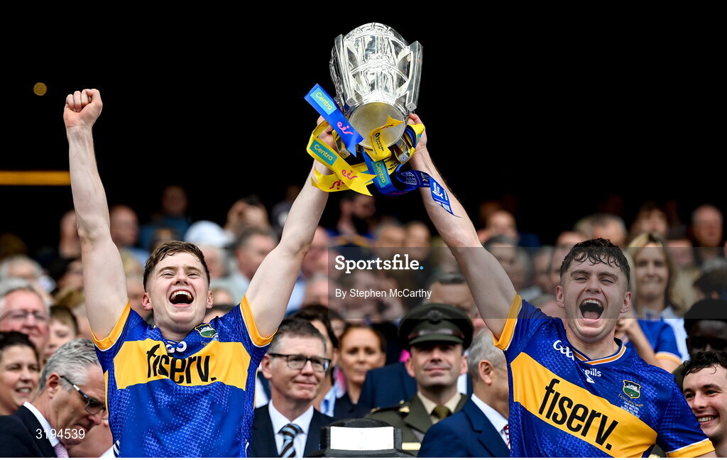 20 July 2025; Darragh Stakelum, left, and Conor Stakelum of Tipperary lift the Liam MacCarthy cup after victory in the GAA Hurling All-Ireland Senior Championship final match between Cork and Tipperary at Croke Park in Dublin. Photo by Stephen McCarthy/Sportsfile