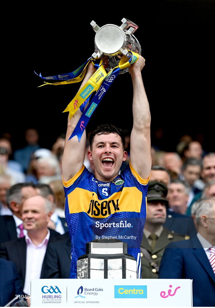 20 July 2025; Craig Morgan of Tipperary lifts the Liam MacCarthy cup after victory in the GAA Hurling All-Ireland Senior Championship final match between Cork and Tipperary at Croke Park in Dublin. Photo by Stephen McCarthy/Sportsfile