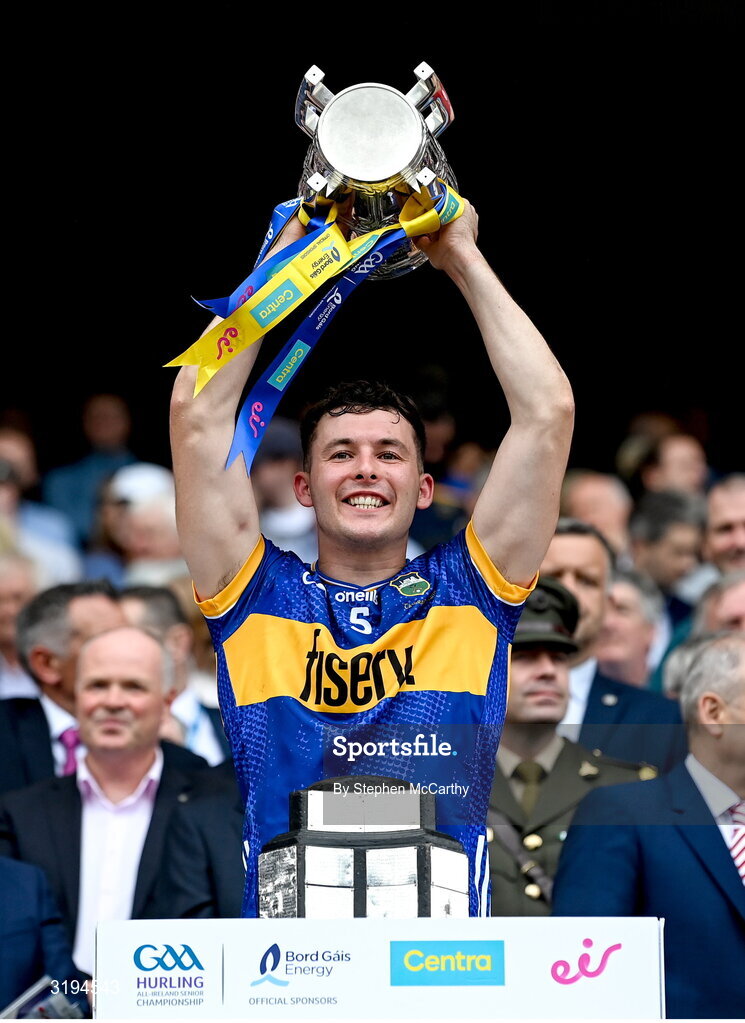20 July 2025; Craig Morgan of Tipperary lifts the Liam MacCarthy cup after victory in the GAA Hurling All-Ireland Senior Championship final match between Cork and Tipperary at Croke Park in Dublin. Photo by Stephen McCarthy/Sportsfile