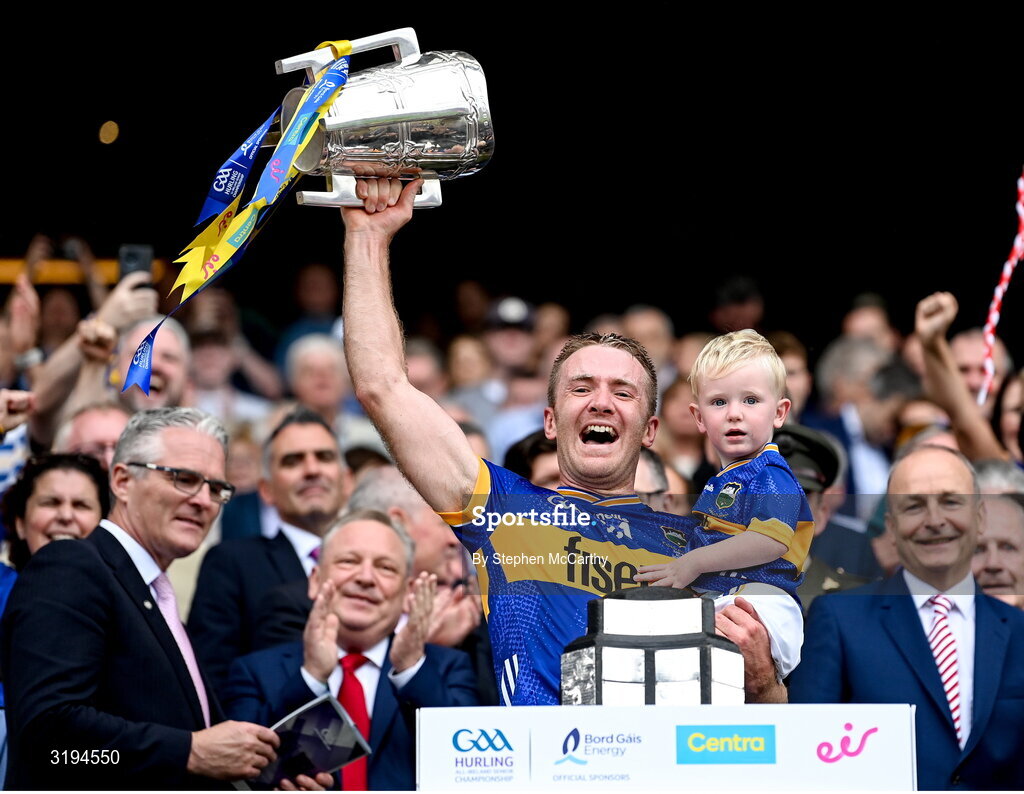 20 July 2025; Noel McGrath of Tipperary and his son Sam lift the Liam MacCarthy cup after victory in the GAA Hurling All-Ireland Senior Championship final match between Cork and Tipperary at Croke Park in Dublin. Photo by Stephen McCarthy/Sportsfile