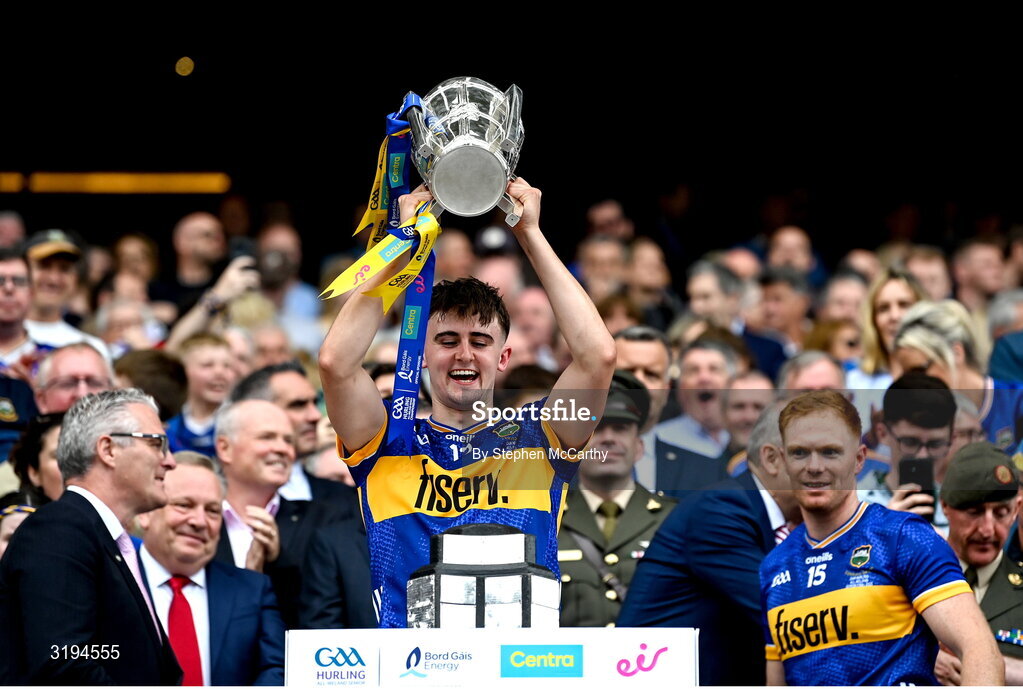 20 July 2025; Sam O’Farrell of Tipperary lifts the Liam MacCarthy cup after victory in the GAA Hurling All-Ireland Senior Championship final match between Cork and Tipperary at Croke Park in Dublin. Photo by Stephen McCarthy/Sportsfile
