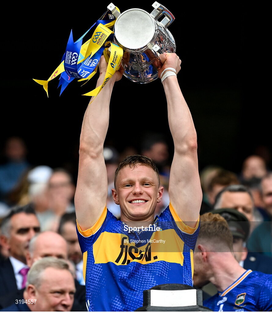 20 July 2025; Bryan O'Mara of Tipperary lifts the Liam MacCarthy cup after victory in the GAA Hurling All-Ireland Senior Championship final match between Cork and Tipperary at Croke Park in Dublin. Photo by Stephen McCarthy/Sportsfile