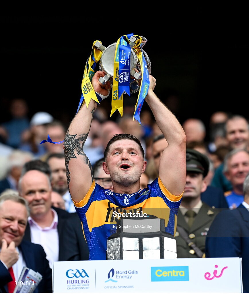 20 July 2025; Willie Connors of Tipperary lifts the Liam MacCarthy cup after victory in the GAA Hurling All-Ireland Senior Championship final match between Cork and Tipperary at Croke Park in Dublin. Photo by Stephen McCarthy/Sportsfile