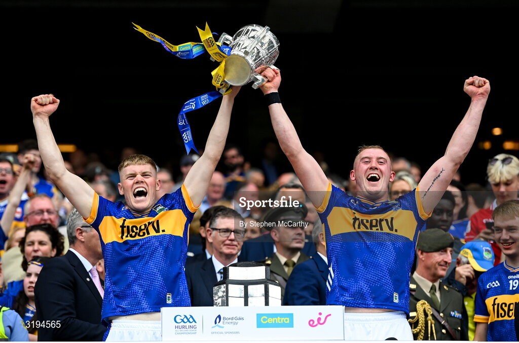 20 July 2025; Oisín O'Donoghue, left, and Eoghan Connolly of Tipperary lift the Liam MacCarthy cup after victory in the GAA Hurling All-Ireland Senior Championship final match between Cork and Tipperary at Croke Park in Dublin. Photo by Stephen McCarthy/Sportsfile