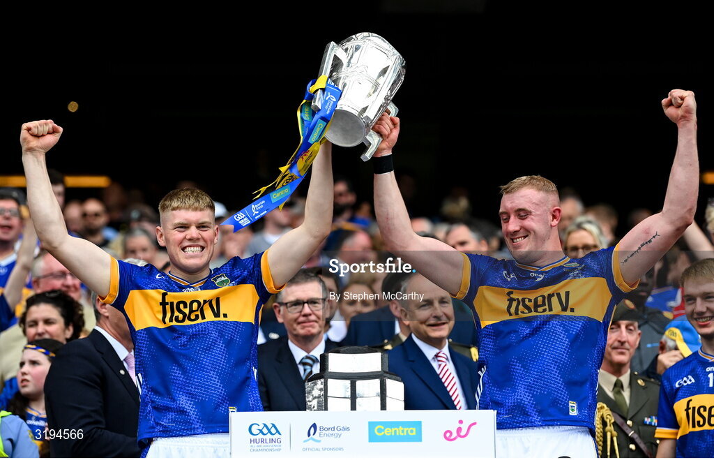 20 July 2025; Oisín O'Donoghue, left, and Eoghan Connolly of Tipperary lift the Liam MacCarthy cup after victory in the GAA Hurling All-Ireland Senior Championship final match between Cork and Tipperary at Croke Park in Dublin. Photo by Stephen McCarthy/Sportsfile