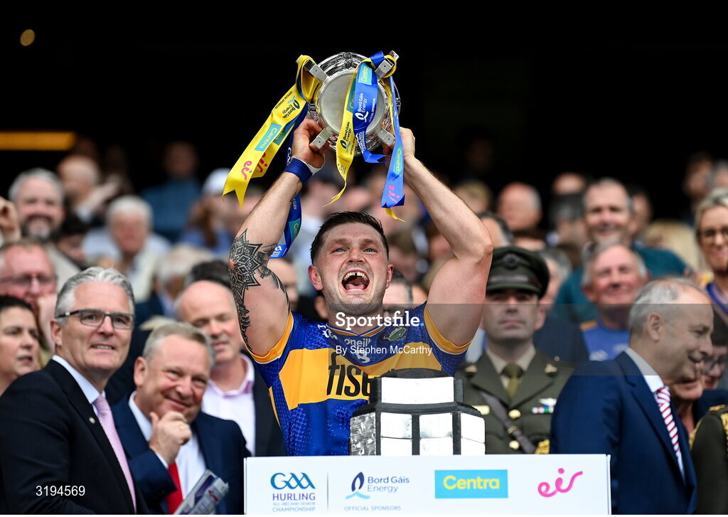 20 July 2025; Willie Connors of Tipperary lifts the Liam MacCarthy cup after victory in the GAA Hurling All-Ireland Senior Championship final match between Cork and Tipperary at Croke Park in Dublin. Photo by Stephen McCarthy/Sportsfile