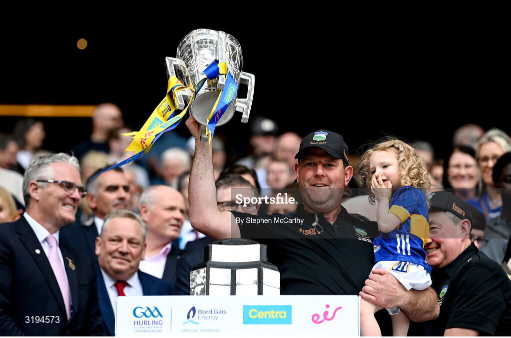 20 July 2025; Tipperary selector Declan Laffan lifts the Liam MacCarthy cup after victory in the GAA Hurling All-Ireland Senior Championship final match between Cork and Tipperary at Croke Park in Dublin. Photo by Stephen McCarthy/Sportsfile