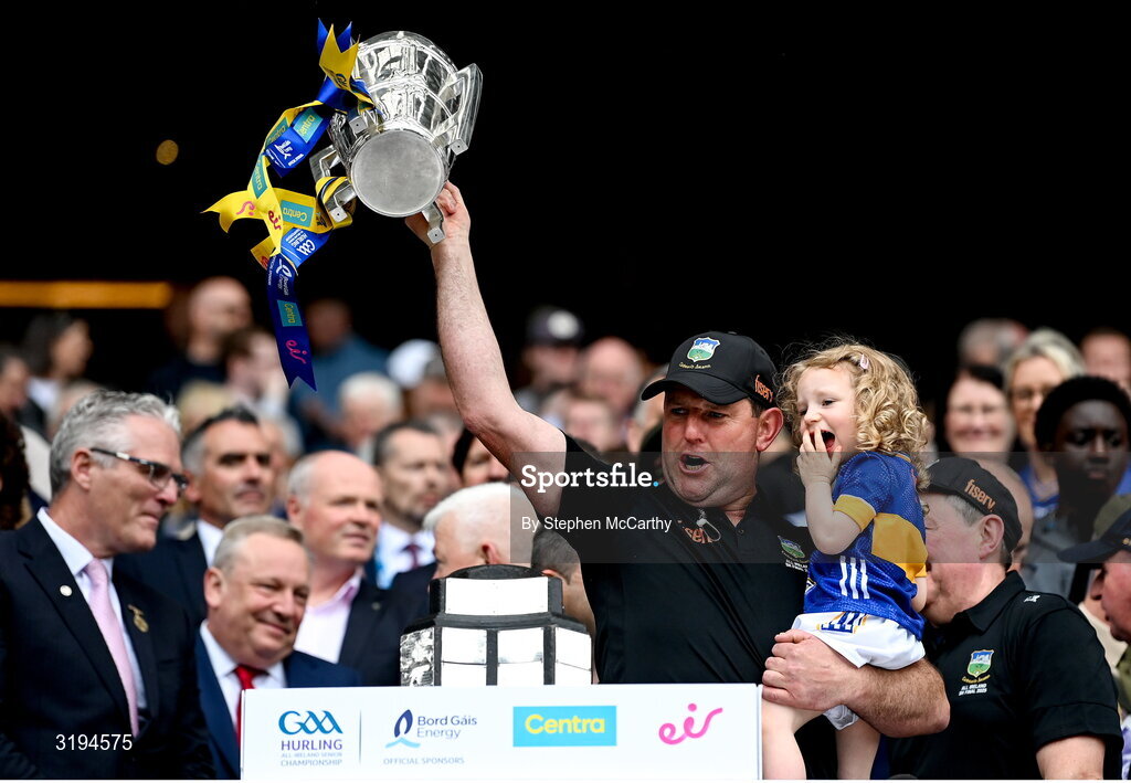 20 July 2025; Tipperary selector Declan Laffan lifts the Liam MacCarthy cup after victory in the GAA Hurling All-Ireland Senior Championship final match between Cork and Tipperary at Croke Park in Dublin. Photo by Stephen McCarthy/Sportsfile