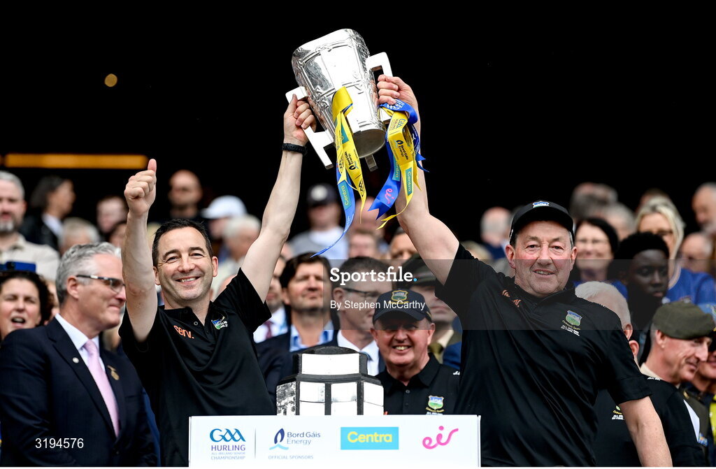 20 July 2025; Tipperary selectors Michael Bevans, left, and TJ Ryan lift the Liam MacCarthy cup after victory in the GAA Hurling All-Ireland Senior Championship final match between Cork and Tipperary at Croke Park in Dublin. Photo by Stephen McCarthy/Sportsfile
