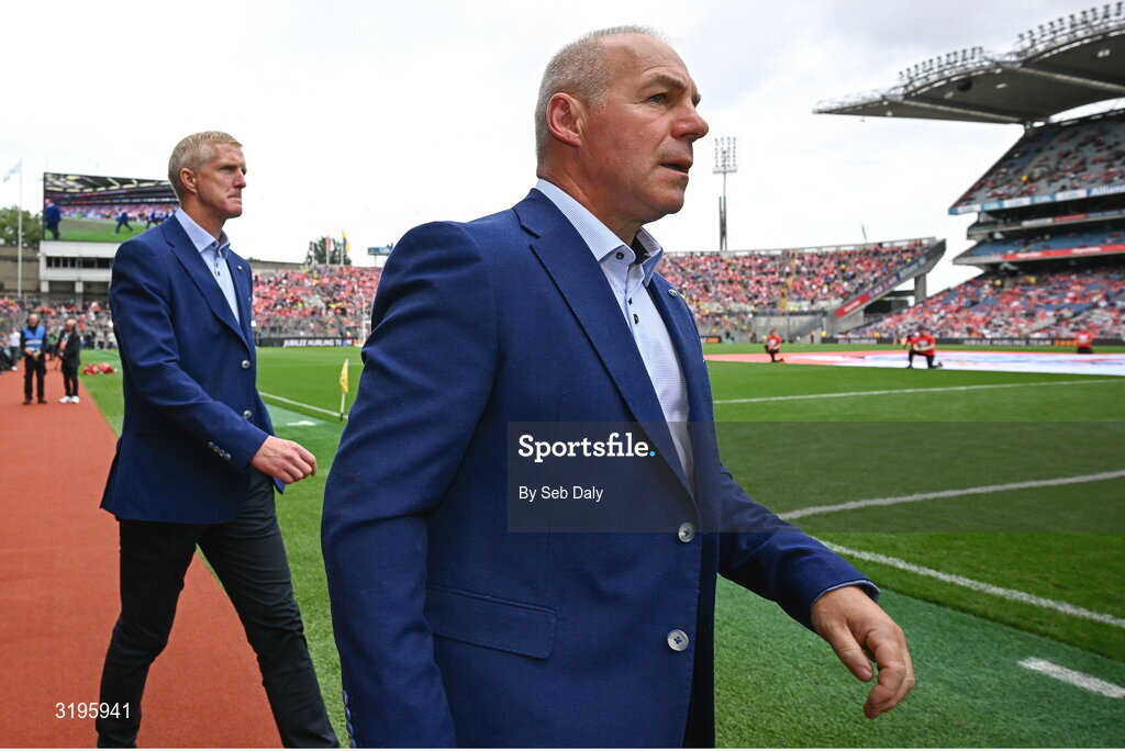 20 July 2025; Charlie Carter, right, and Henry Shefflin of the 2000 All-Ireland winning Kilkenny hurling jubilee team who were honoured before the GAA Hurling All-Ireland Senior Championship final match between Cork and Tipperary at Croke Park in Dublin. Photo by Seb Daly/Sportsfile